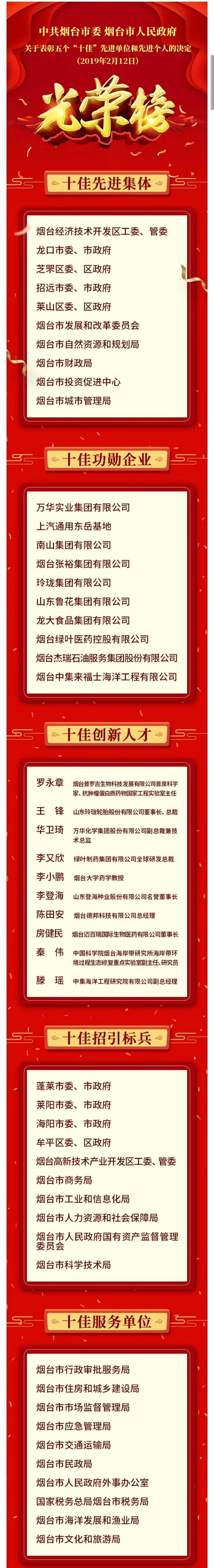2月12日,2018年煙臺高質量發展總結表彰大會召開。會議隆重表彰了煙臺市十佳先進集體、十佳功勛企業、十佳創新人才、十佳招引標兵和十佳服務單位。龍大食品集團有限公司榮獲“煙臺市十佳功勛企業”稱號。