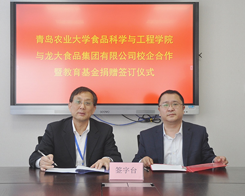 4月21日,龍大食品集團(tuán)有限公司與青島農(nóng)業(yè)大學(xué)校企合作簽約儀式在龍大集團(tuán)總部舉行。龍大集團(tuán)總經(jīng)理張德潤(rùn)、青島農(nóng)業(yè)大學(xué)食品科學(xué)與工程學(xué)院院長(zhǎng)王寶作為雙方代表在合作協(xié)議上簽字。