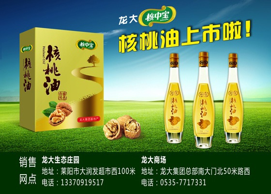 龍大“核中寶”核桃油上市了。核中寶核桃油精選龍大自有基地生產(chǎn)的核中寶核桃,嚴格按照龍大蔬菜基地“五統(tǒng)一”管理模式進行管理、生產(chǎn),綠色、安全、健康、營養(yǎng)。