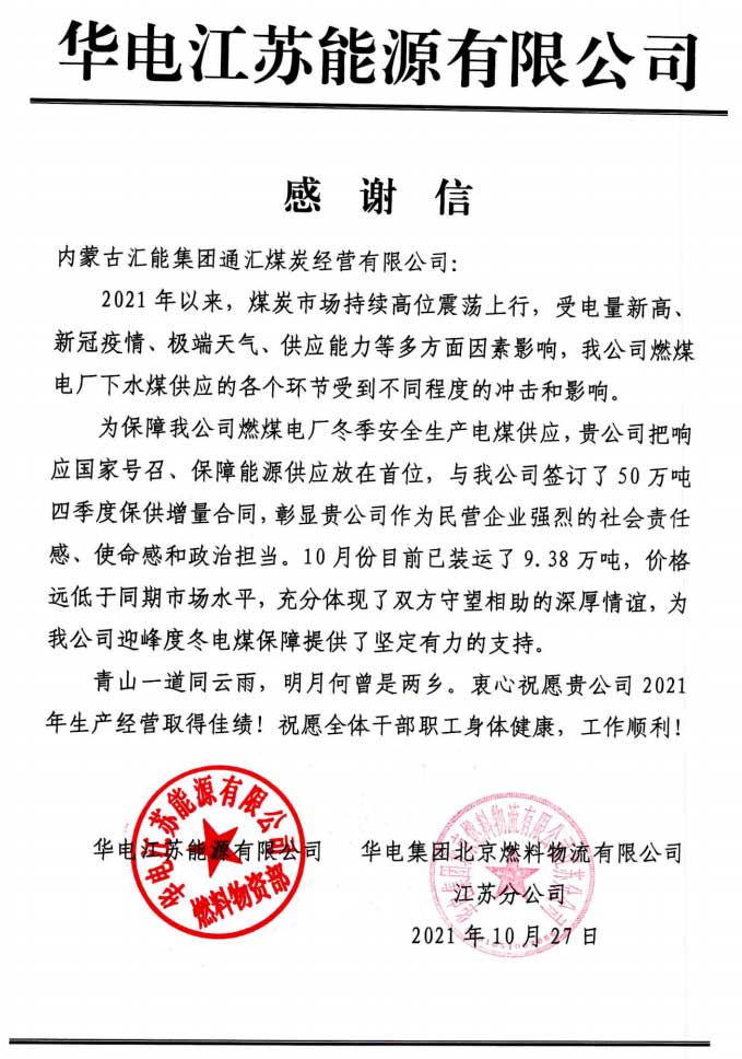 華電江蘇能源有限公司、華電集團北京燃料公司給匯能集團的感謝信